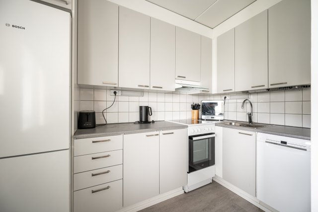 - Jääkaappipakastin, liesi (keraaminen), astianpesukone, ja liesituuletin