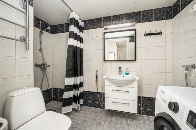 - WC-istuin, suihku, pesukoneliitäntä, pesuallas, allaskaappi, peili, bidee-suihku, pyyhekuivain, ja lattialämmitys