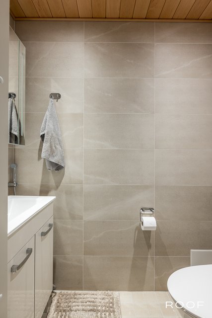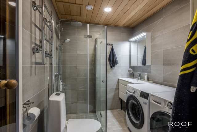 - WC-istuin, suihku, suihkuseinä, pesukoneliitäntä, peili, pesuallas, allaskaappi, ja kuivauspatteri