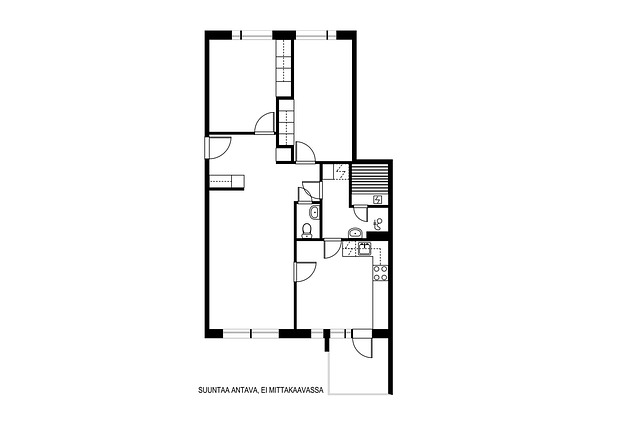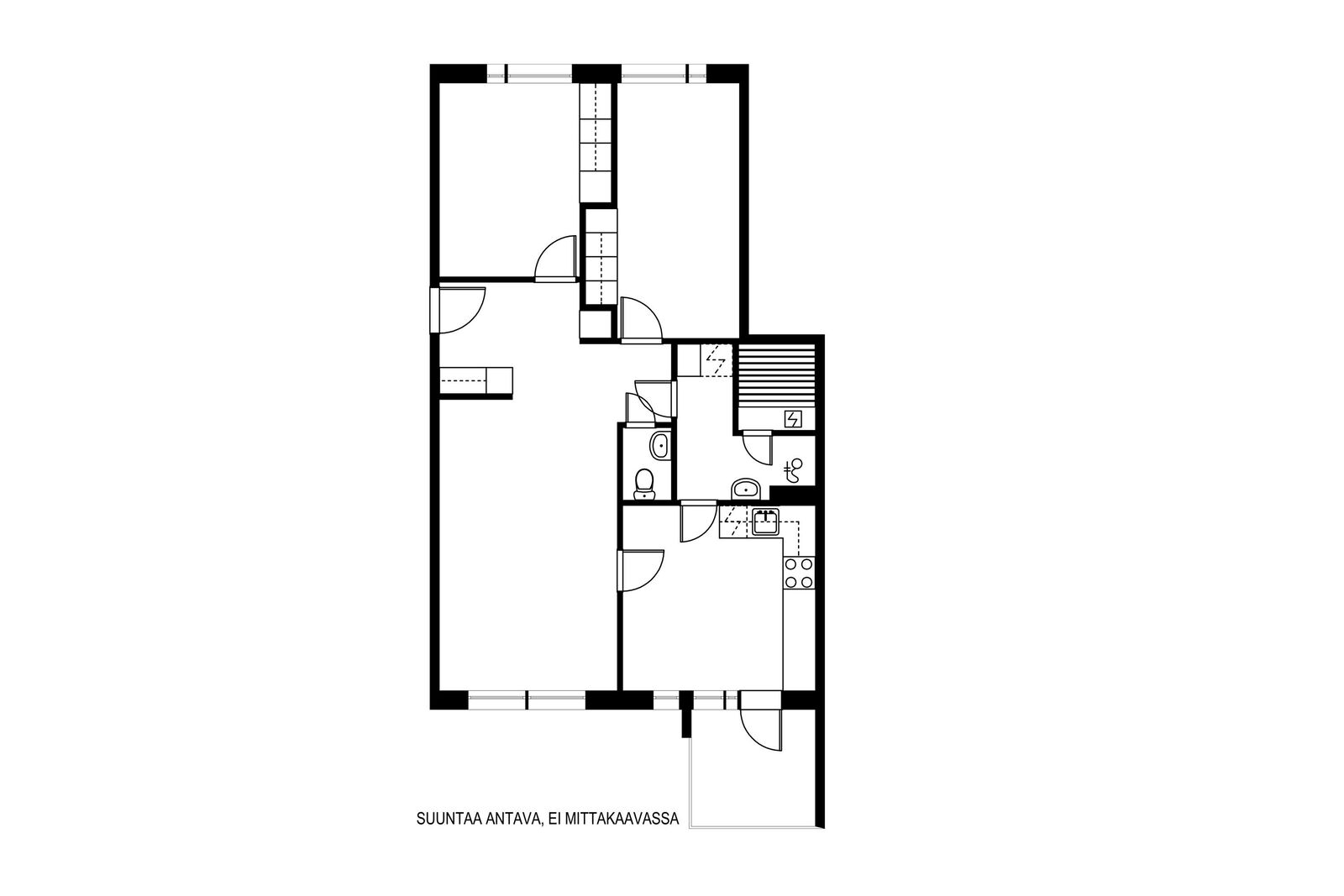 Asunnossa on erinomainen pohjaratkaisu, kaksi tilavaa makuuhuonetta, valoa tulviva olohuone sekä erillinen keittiö, johon mahtuu hyvin isompikin ruokailuryhmä. Keittiöstä on kulku suojaisalle parvekkeelle. Kylpyhuoneen yhteydessä on oma sauna, jossa nautit pitkän päivän päätteeksi. Lisäksi erillinen wc.