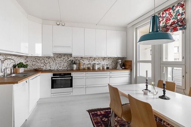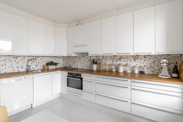 - Valkoiset kaapistot, keittiön välitila: mosaiikkilaatta
