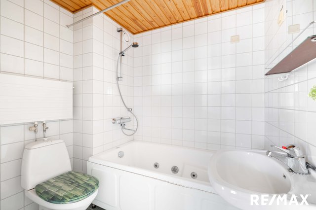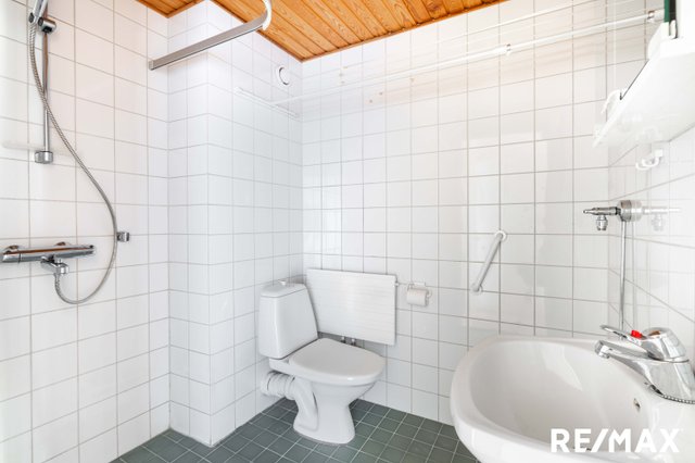 - YK: seinät kaakeloitu, lattia laatoitettu, suihku, wc-istuin, pesuallas, peilikaappi, pesukoneliitäntä AK: seinät kaakeloitu, lattia laatoitettu, poreamme, (suihku), wc-istuin, pesuallas, peili