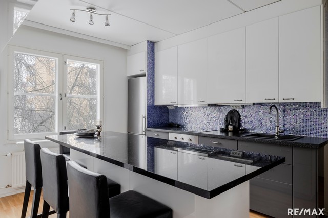 Asunnon tyylikäs keittiö on kodin ehdoton katseenvangitsija ja toimii luontevana kokoontumispaikkana. Reilun kokoinen kivitasoinen saareke on ruoanlaittajan unelma ja sen ääreen mahtuu vaivatta ruokailemaan myös isompi seurue. Kaunis, uusittu parketti tuo lämpöä ja yhtenäisyyttä koko asuntoon jatkuen saumattomasti huoneesta toiseen. Makuuhuoneessa on hyvin säilytystilaa ja tilavasta olohuoneesta on käynti suojaisalle parvekkeelle.