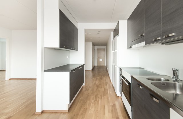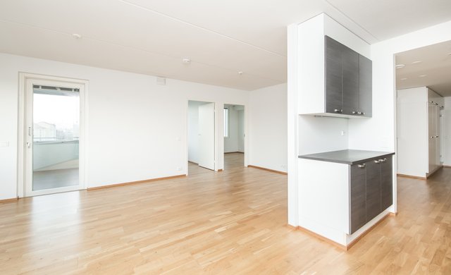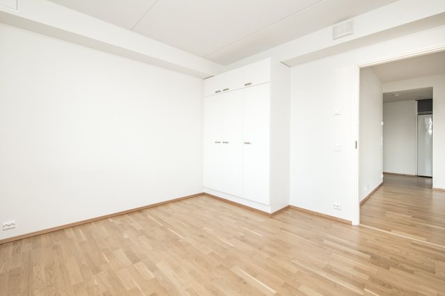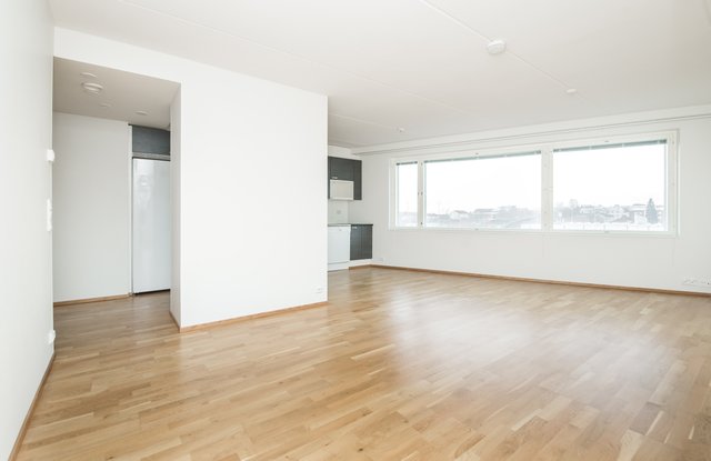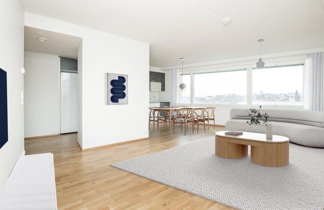 Bostaden är belägen på fjärde våningen och erbjuder vidsträckta vyer och rikligt med naturligt ljus. Det moderna köket är utrustat med alla nödvändiga vitvaror, såsom diskmaskin och keramikhäll. Från