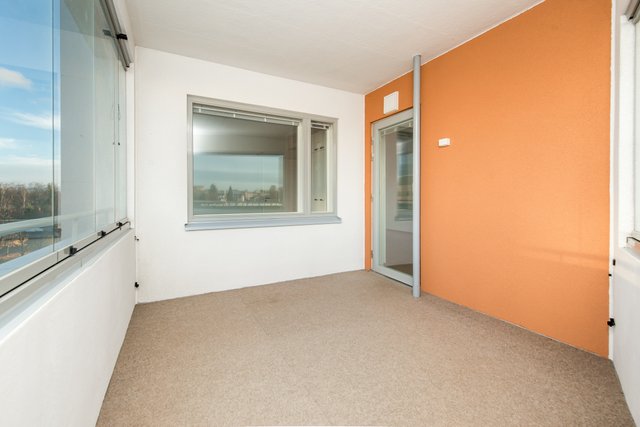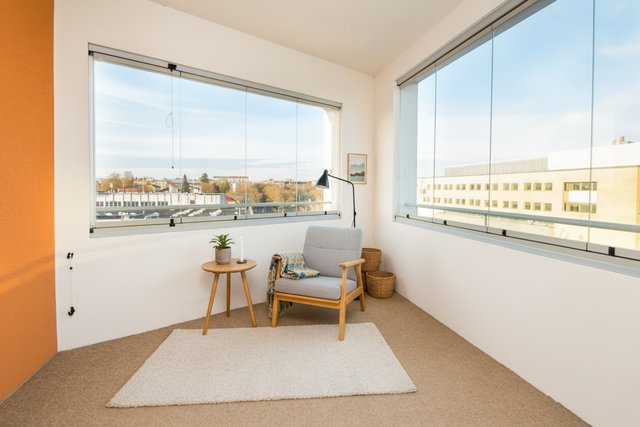 balkongen kan man njuta av morgonkaffet i lugn och ro, då den är inglasad och erbjuder ett bekvämt extra utrymme året runt.