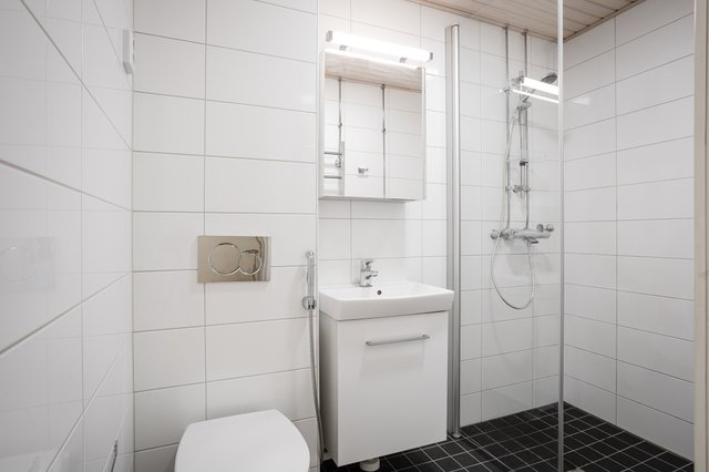 - VARUSTUS: Suihku, suihkuseinä, WC-istuin, peili-ja allaskaappi SEINÄT: Laatta LATTIA: Laatta