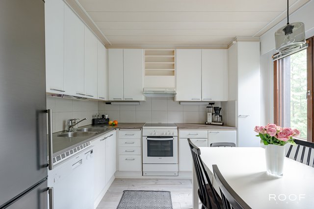 - VARUSTELU: Jääkaappipakastin, astianpesukone, keraaminen liesi, uuni, liesituuletin huippuimurilla, kaapistot. VÄLITILA: laatta TYÖTASO: laminaatti/rosteripelti SEINÄT: maalattu LATTIA: laminaatti