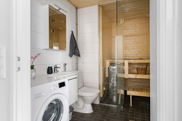 - WC-istuin, suihku, suihkuseinä, pesukoneliitäntä, lattialämmitys, peilikaappi, bidee-suihku, ja pesuallas