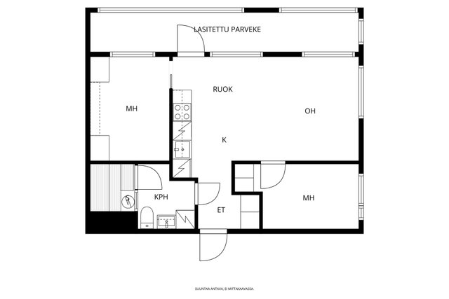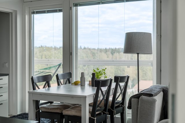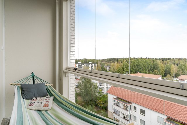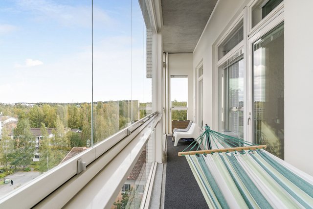 Koko huoneiston levyinen lasitettu parveke kutsuu nauttimaan auringosta pitkälle syksyyn, ja korkea huonekorkeus lisää tilan tuntua entisestään.