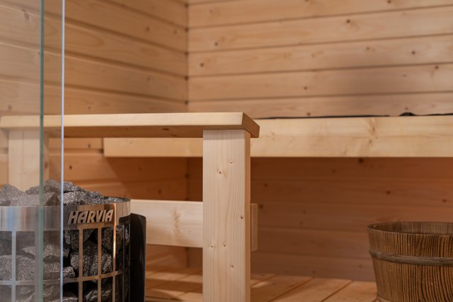 Tilavassa kylpyhuoneessa on moderni sauna, jossa tyylikäs lasiseinä ja pilarikiuas luovat ylellisen tunnelman.