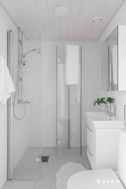 - Tilava, laatoitettu kylpyhuone lattialämmityksellä. Peili- ja allaskaappi, suihkuseinät, pesukoneliitäntä. Remontoitu linjasaneerauksen yhteydessä 2022.