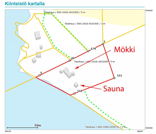 Tyyliltään perinteinen, hyvin hoidettu mökki, johon pääsee myös autolla pihaan asti (yhteysalus). Ilmeikkään vaihtelevaa etelä-lounaisrinnettä, johon on aseteltu rakennukset hyville paikoille. Rantaviivaa etelälounaaseen n.65m, vastakkaisen Pyytin saaren ansiosta suojassa käytännössä kaikilta tuulilta. Yksityisyys pihapiirissä täydellinen. Kahteen kertaan laajennettu päämökki, jossa hyvät makuutilat koko perheelle. Edustalla terassi ja kesäkeittiö. Lähempänä laituria erillinen saunarakennus, jossa myös saunatupa antamassa lisämakuutilaa. Runsaasti varastotilaa kaikelle tarpeelliselle tavaralle ja polttopuille. Melko nopeasti syvenevä ranta, johon pääsee suoraan laituriin moottoriveneellä. Porakaivo, jonka vettä on käytetty juomavetenä ja tuotto ollut aina riittävä normaalikäytössä. Sähköliittymä. Kaksi ilmalämpöpumppua hoitavat tarpeen mukaan niin lämmityksen kuin viilennyksen.