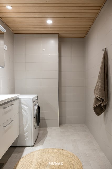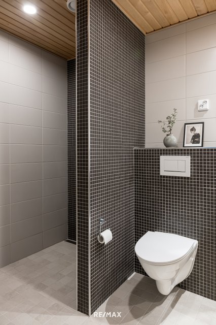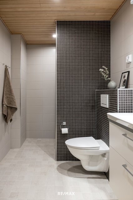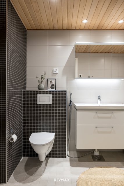 - WC-istuin, suihku, pesukoneliitäntä, pesuallas, allaskaappi, peilikaappi, lattialämmitys, bidee-suihku, ja suihkuseinä