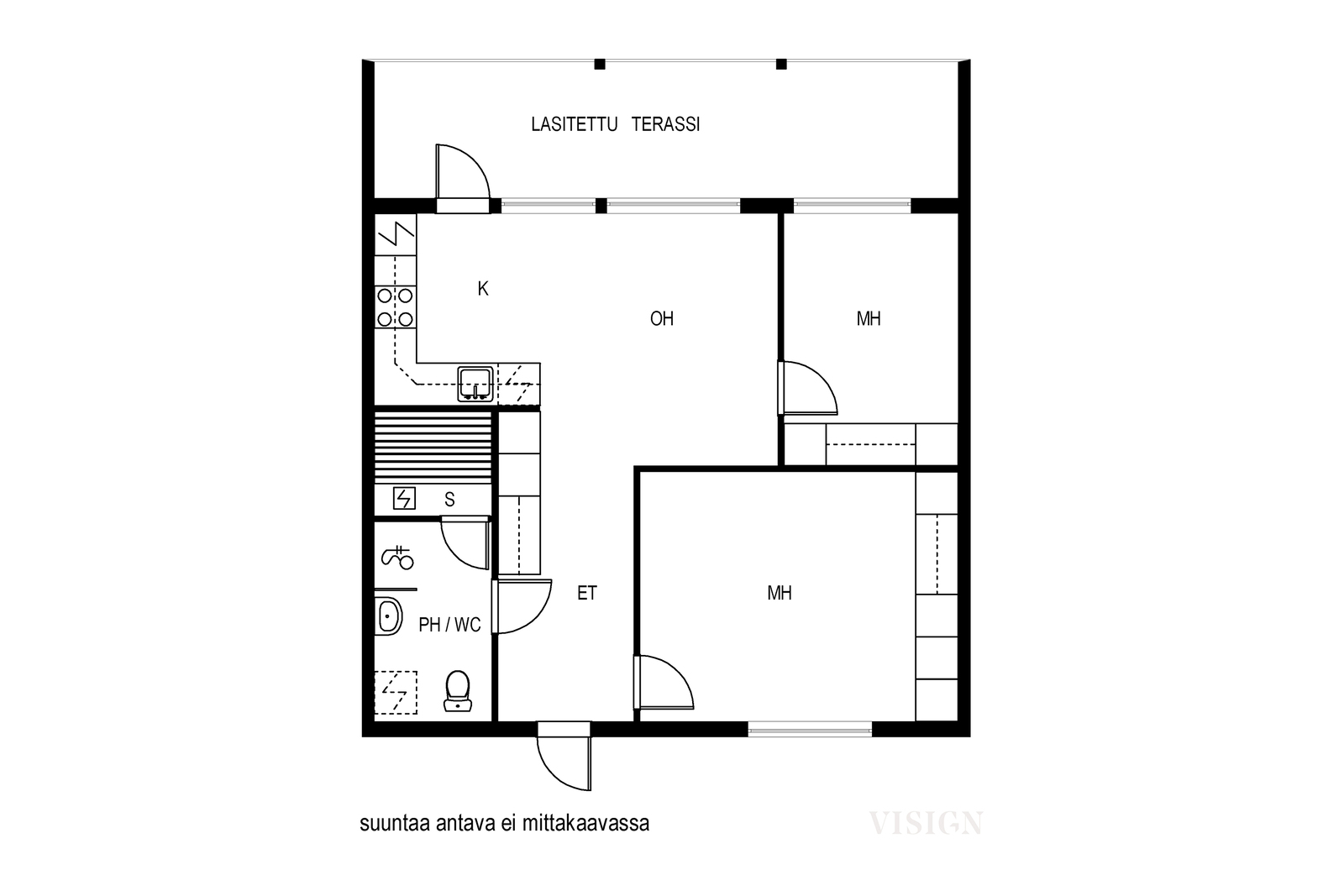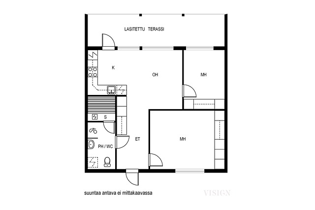 Olohuone ja keittiö on tässä kodissa yhdistetty suureksi, valoisaksi kokonaisuudeksi. Molemmissa makuuhuoneissa kokonaisen seinän verran kaappitilaa. Näyttävällä lasiseinällä varustettu saunallinen pesuhuone, jossa myös kodinhoitotoimille riittävästi tilaa. Koko asunnon levyisellä lasitetulla, eteläsuuntaisella terassilla vietät aikaa keväästä pitkälle syksyyn. Toinen terassi löytyy sisäänkäynnin yhteydestä.