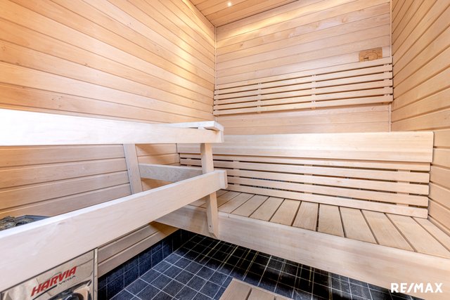 - Oma sauna, lauteet tervaleppää Lattia: laatta Seinät: puu Kiukaan tyyppi: sähkökiuas