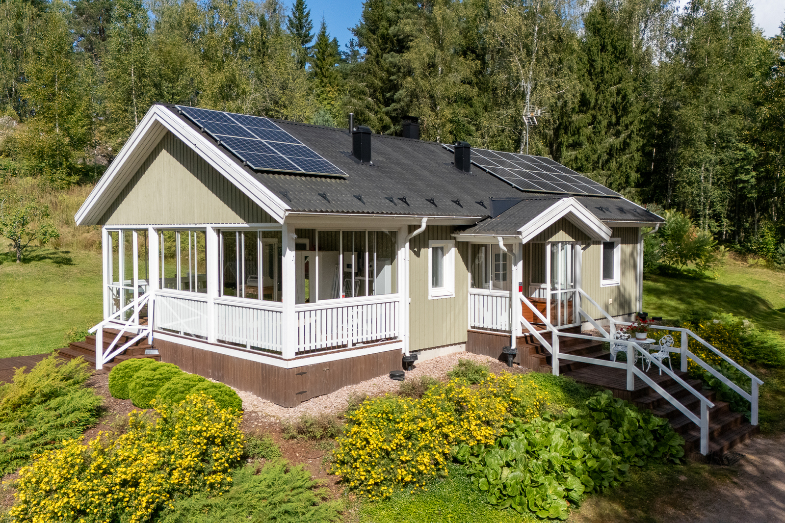 Päärakennus tarjoaa toimivat ja viihtyisät 91 m² asuintilat, jotka ovat heti muuttovalmiit - eikä akuuttia remonttitarvetta ole lähivuosina. Valoa tulvivat huoneet, selkeä pohjaratkaisu ja laadukkaat pintamateriaalit luovat kotoisan tunnelman. Kokonaisuutta täydentää täysin varusteltu ja talviasuttava 42 m² vierastalo, joka sopii loistavasti etätyöhön, vieraille tai vaikka harrastetilaksi. Aurinkopaneelien tuottamaa sähköä voi hyödyntää omassa käytössä ja myydä ylimäärän.