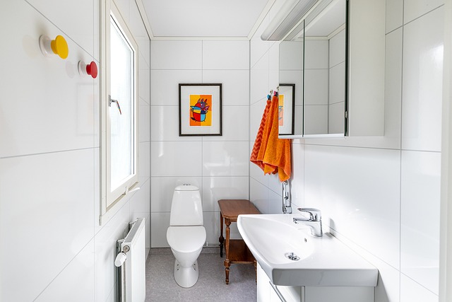 - Erillisessä wc:ssä lattia muovimattoa ja seinät laatoitetut. WC-istuin/bide, lavuaari ja peilikaappi