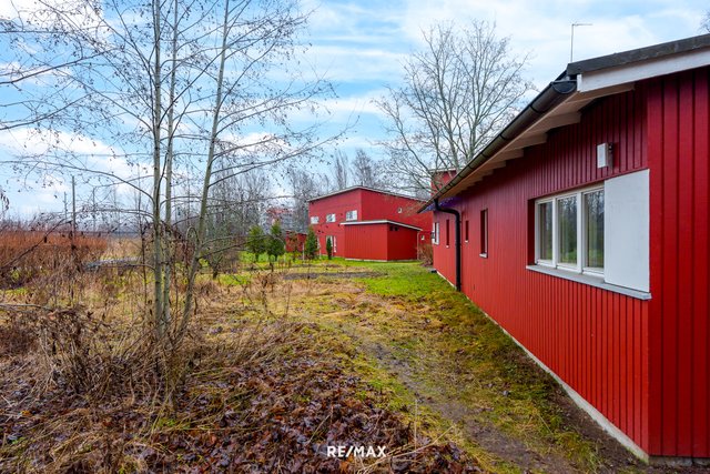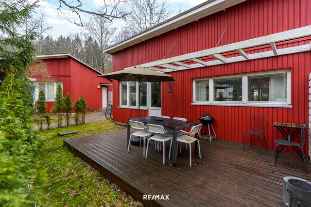 - Terassin lisäksi on nurmikkoalue, aidattu piha, jota osittain reunustaa tuija-aita.