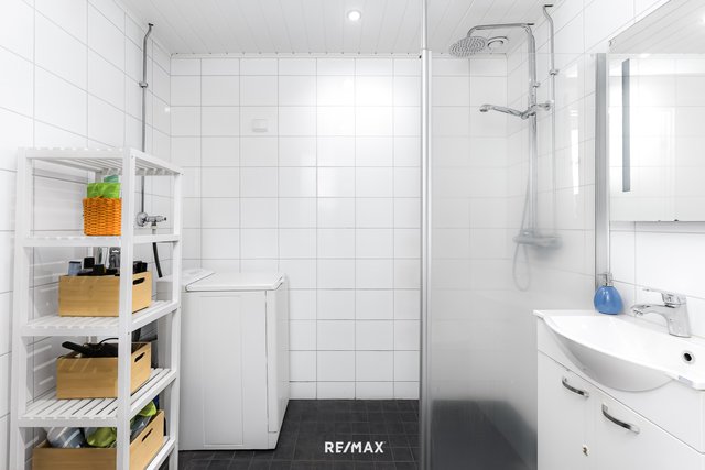 - WC-istuin, suihku, pesukoneliitäntä, pesuallas, allaskaappi, suihkuseinä, bidee-suihku, ja peili