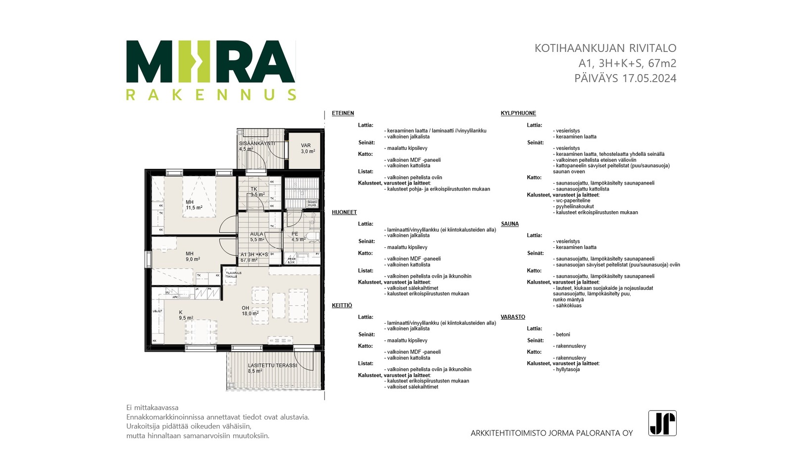 - Eteisessä ja kosteissa tiloissa laattalattiat, muissa tiloissa vinyyli tai laminaatti.