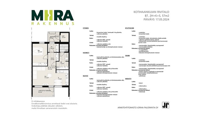 - Saunassa ja kylpyhuoneessa lämpökäsitelty tervaleppäpaneeli, muissa tiloissa mdf-paneeli tai maalattu kipsilevykatto.