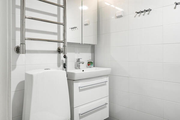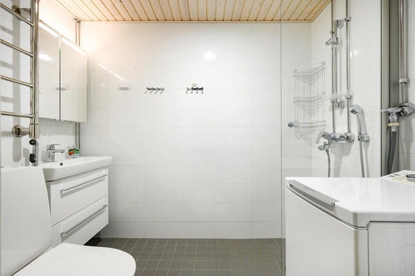 - suihku+kääntyvä suihkuseinä, wc, lavuaari+allaskaappi, pyyheliinapatteri, bidesuihku, lattialämmitys termostaatilla, laatoitettu ja kaakeloitu 1/1, kylpyhuone on v.2020 taloyhtiön linjasaneerauksessa remontoima