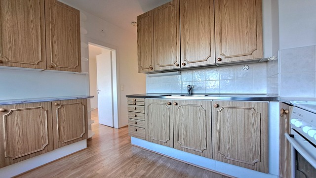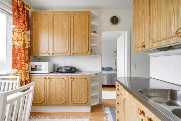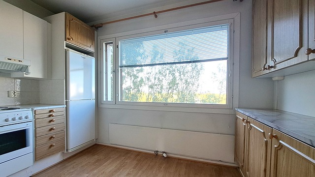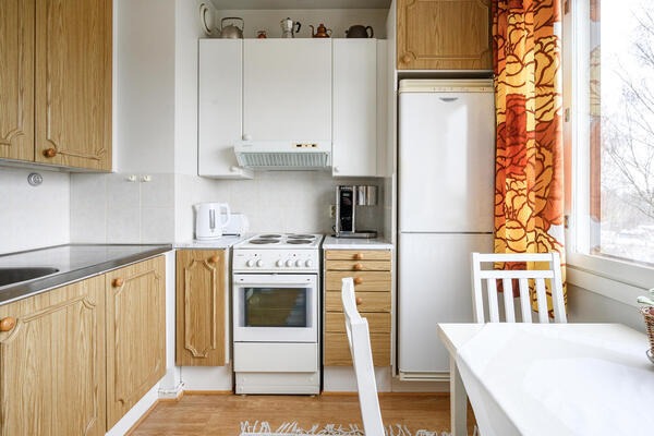 - Rosenlew jääkaappi-pakastin, tammimelamiinikaapistot, 4-levyinen sähköliesi, liesituuletin suodattimella lattia: tammilaminaatti seinät:maalattu katto:maalattu