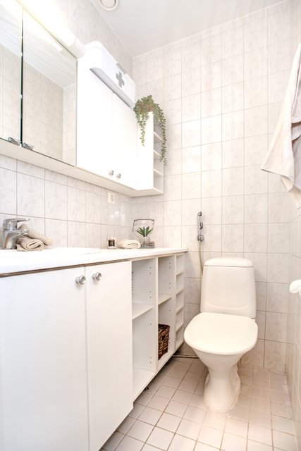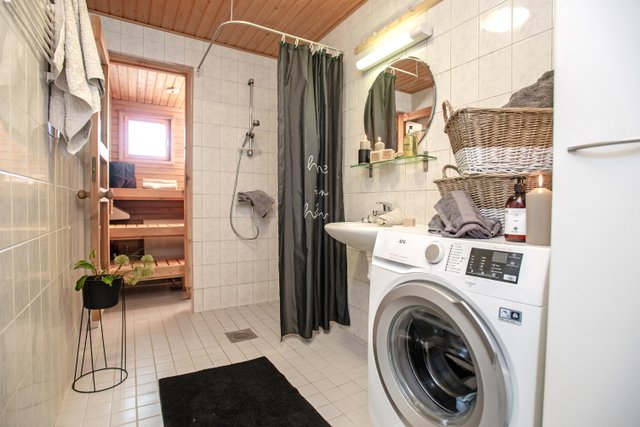 - Suihku, pesukoneliitäntä, lattialämmitys, ja allaskaappi