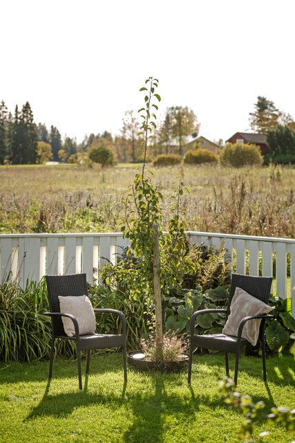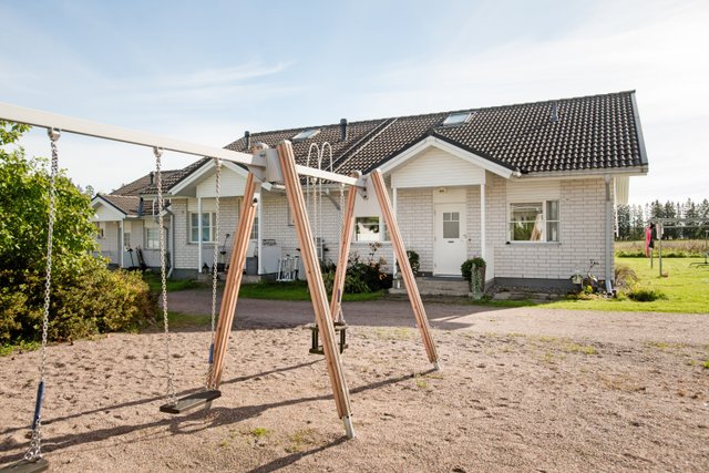 - Rivitaloyhtiön yhteiselle piha-alueelle, toiselta puolelta terassien ja puutarhan yli avaralle peltoalueelle.