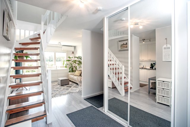 Asunnossa on kaikkiaan 100m2, koostuen olohuoneesta, kahdesta alakerran makuuhuoneesta, vaatehuoneesta, keittiöstä, erillisestä wc:stä, kylpyhuoneesta ja ikkunallisesta saunasta. Lisäksi koko yläkerta on avaraa ja valoisaa ikkunallista avointa tilaa. Olohuoneen ja keittiön välistä suora kulku puutarhaan joka aidattu yhtyen kauniin esteettömään peltoalueeseen. Keittiö on näppärä ja toimiva josta pääsee kulkemaan huoneiston ympäri niin olohuoneeseen, kuin eteiseenkin. Päämakuuhuoneen yhteydessä tilava vaatehuone. Muissa huoneissa hyvin kaappitilaa. Tämä kaksitasoinen koti tarjoaa erinomaiset puitteet viihtyisään asumiseen.
