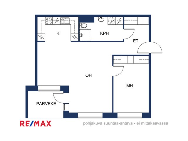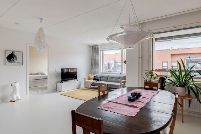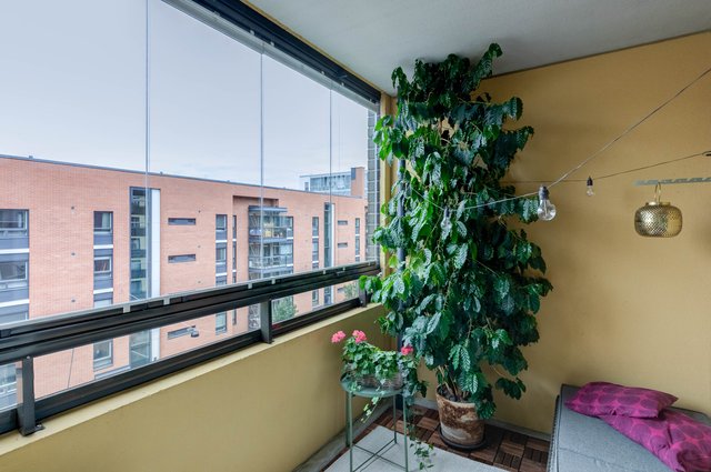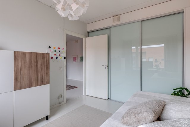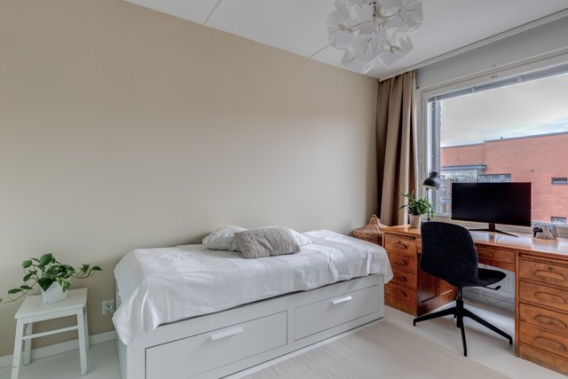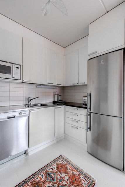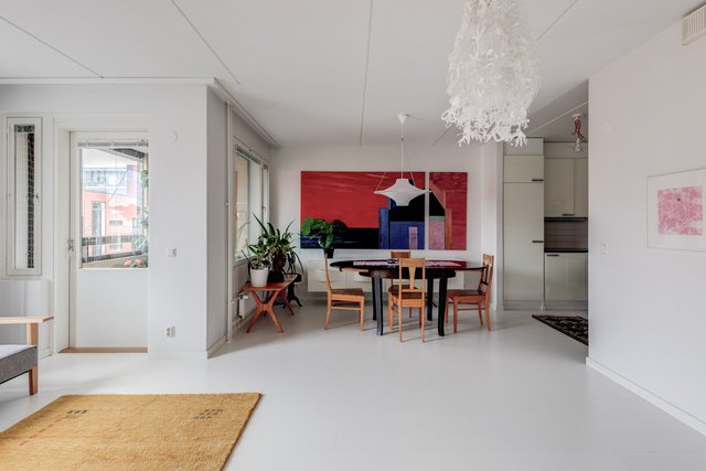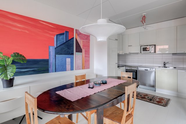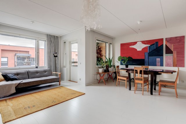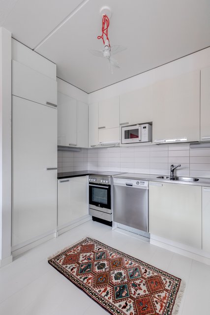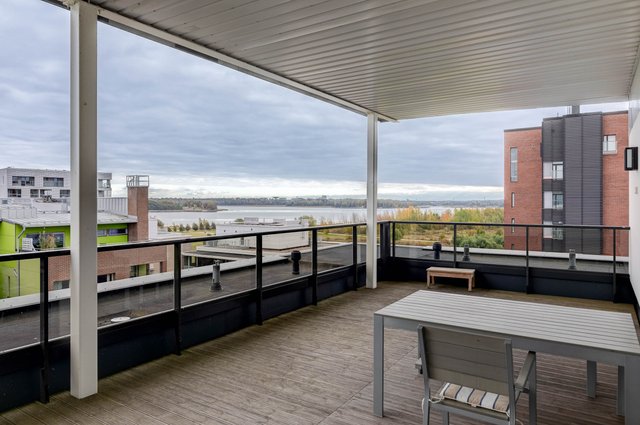 Laadukkailla kodinkoneilla, keraamisella liedellä ja tyylikkäillä kivitasoilla varusteltu avokeittiö sulautuu saumattomasti tilavaan olohuoneeseen. Olohuoneesta on käynti lasitetulle parvekkeelle, joka toimii kuin ylimääräisenä huoneena heti keväästä pitkälle syksyyn. Makuuhuoneessa on mukavasti säilytystilaa ja modernista kylpyhuoneesta löytyy kauniin kylpyammeen lisäksi hyvin tilaa pesutornille. Kylpyamme on irrallinen. Upea, valkoiseksi maalattu parkettilattia tuo lämpimän tunnelman koko huoneistoon.