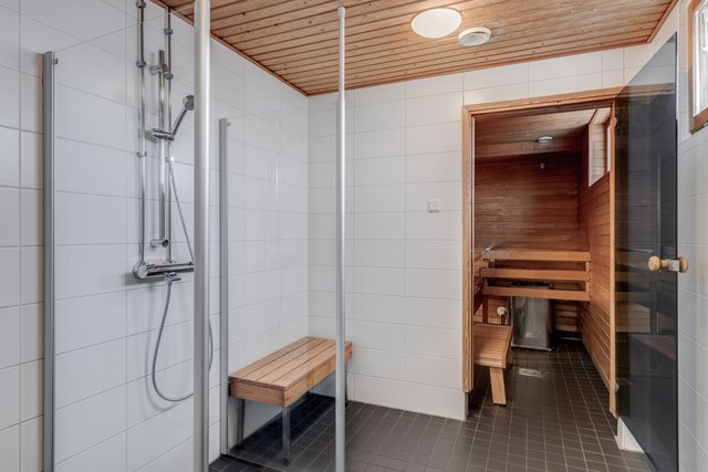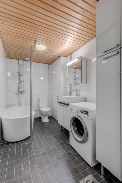 - WC-istuin, suihku, suihkuseinä, pesukoneliitäntä, lattialämmitys, peilikaappi, allaskaappi, bidee-suihku, pyyhekuivain, ja kylpyamme