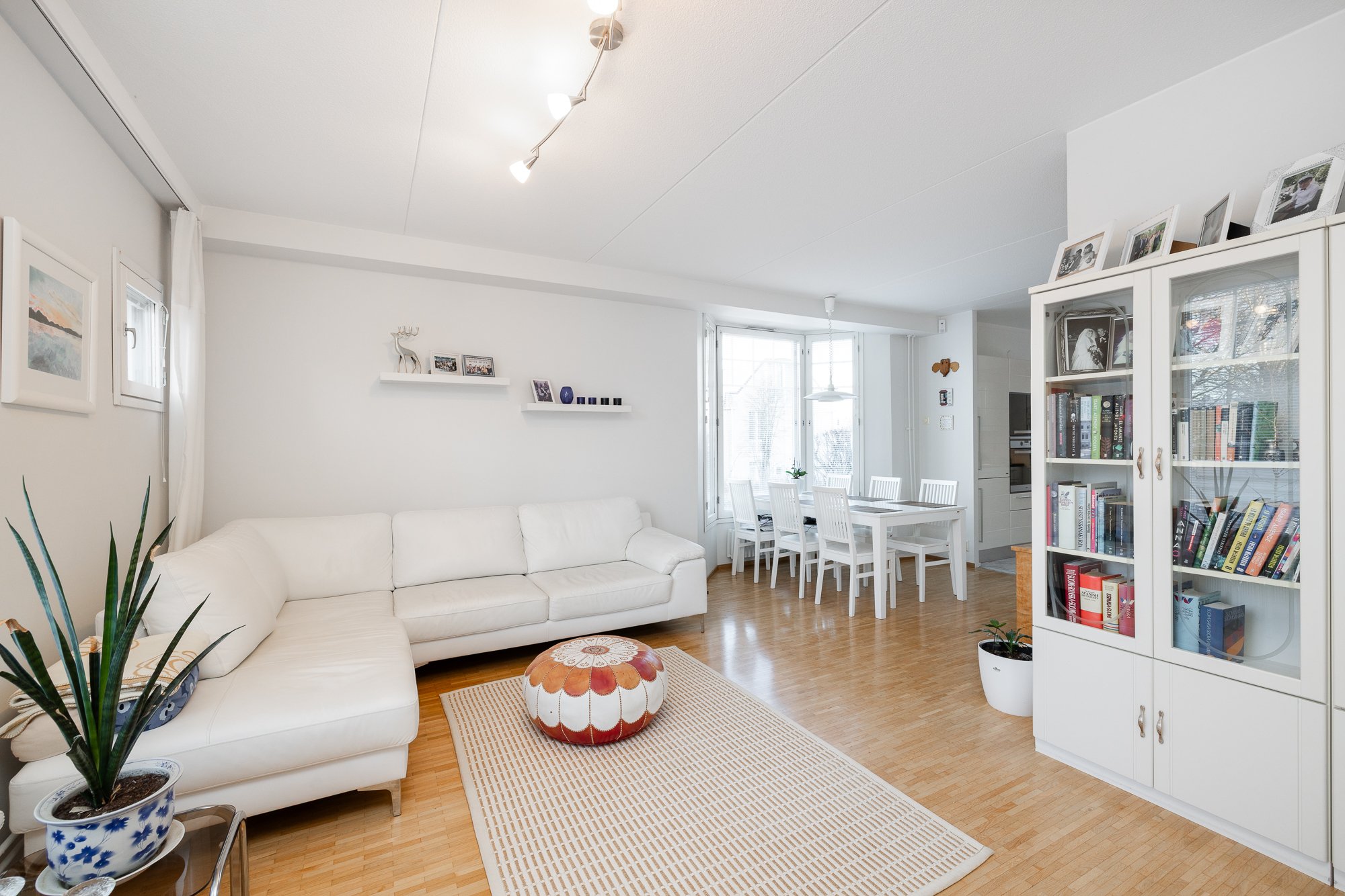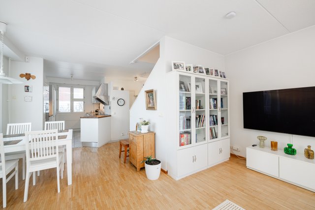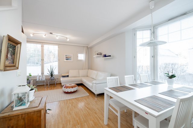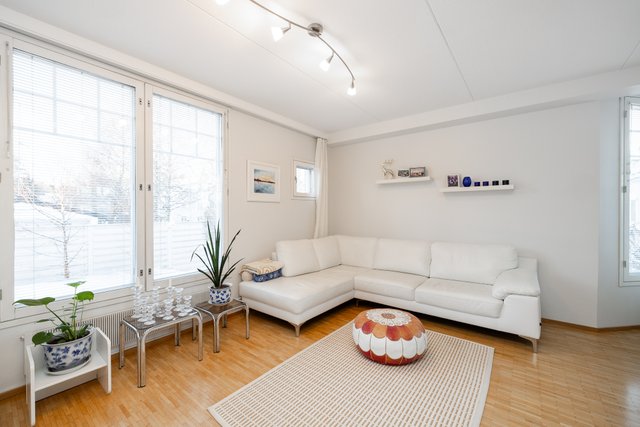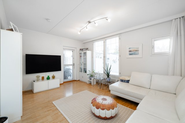 - Valoisa olohuone, josta käynti huoneiston terassi piha-alueelle. Seinät maalattu, lattia parkettia.