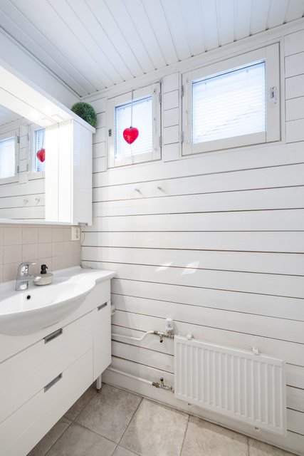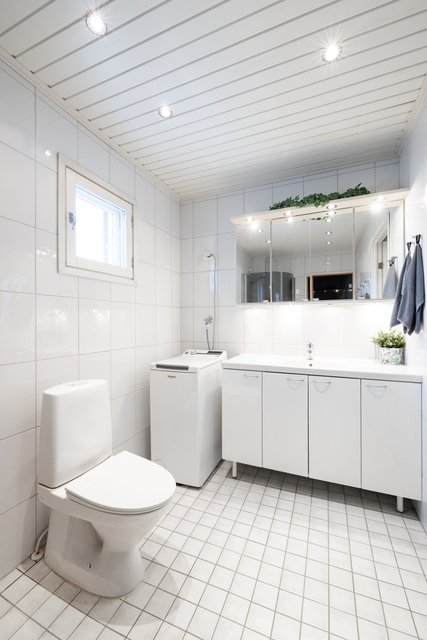 - Ikkunalla varustettu kylpyhuone, suihku, kääntyvät Svedberg lasiset kääntyvät suihkuseinät (sävy: savunharmaa), wc-istuin, peilikaapit, allaskaapit, pesukoneliitäntä, pesuallas, vesikiertoinen lattialämmitys, seinät laatoitettu, lattia laatoitettu.