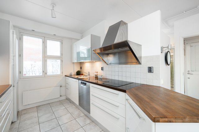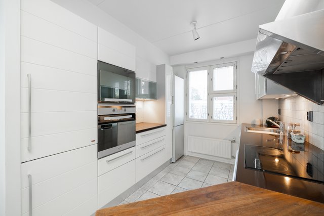 - Kaapistot, jääkaappi / pakastinyhdistelmä, induktioliesi, kiertoilmauuni, aktiivihiilisuodatin, astianpesukone, seinät maalattu, lattia laatoitettu.