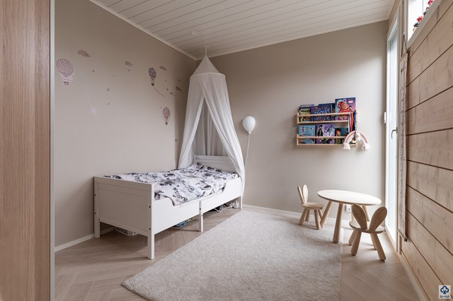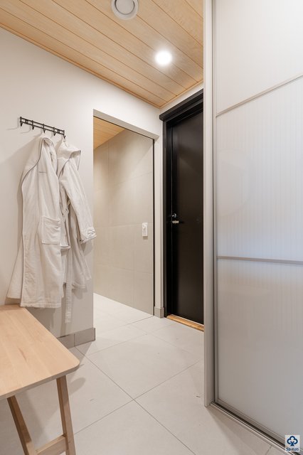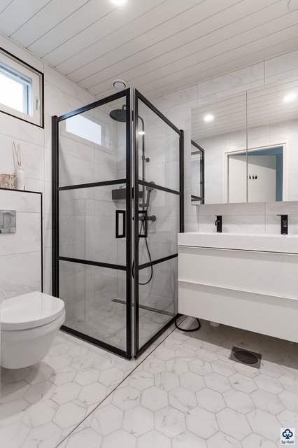 Alakerran kylpyhuone hurmaa kahdella suihkulla, ja tyylikäs lasiseinäinen sauna ikkunalla tuo arkeen luksuksen tuntua. Erillinen kodinhoitohuone käytännöllisine ratkaisuineen helpottaa päivittäisiä askareita. Yläkerrasta löytyvät kolme makuuhuonetta tarjoavat rauhalliset puitteet lepäämiseen, ja päämakuuhuoneen vaatehuone lisää säilytystilaa. Yläkerran oma kylpyhuone suihkulla tekee arjesta sujuvaa isommallakin perheellä.