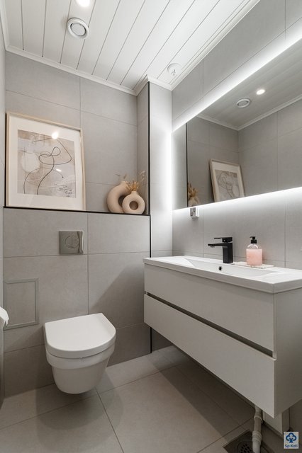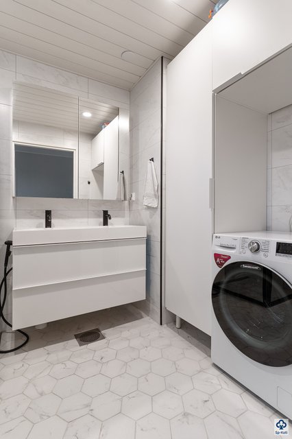 - WC-istuin, suihku, suihkuseinä, pesukoneliitäntä, peilikaappi, lattialämmitys, pesuallas, allaskaappi, ja bidee-suihku