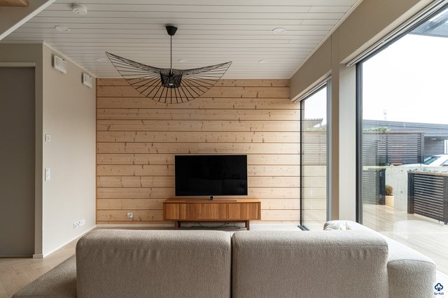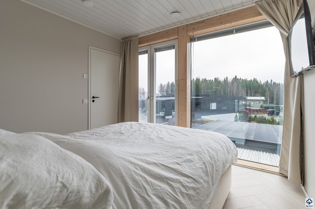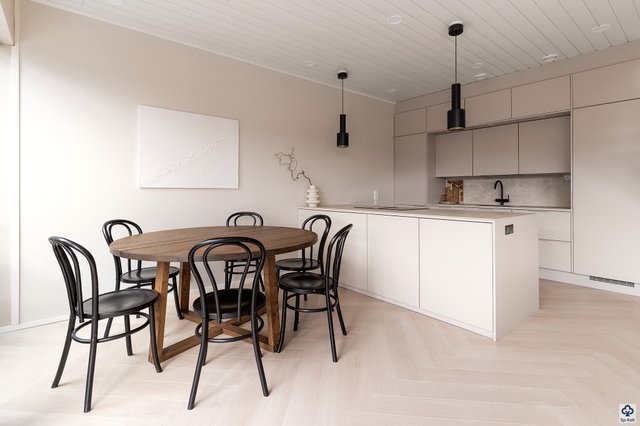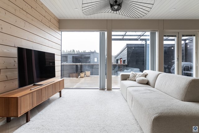 Kodin suuret etelään suuntautuvat ikkunapinnat tulvivat valoa, ja hirsirunko tuo asumiseen lämpimän, laadukkaan tunnelman. Avarassa alakerrassa keittiö ja olohuone muodostavat yhtenäisen ja viihtyisän oleskelualueen, jossa on tilaa yhdessäololle. Keittiön integroidut kodinkoneet ja laadukkaat materiaalit lisäävät arjen mukavuutta, ja kulku koko kodin kiertävälle terassille tekee sisä- ja ulkotilojen yhdistämisestä luontevaa. Terassilta löytyvä poreamme tarjoaa mainiot puitteet rentoutumiselle.