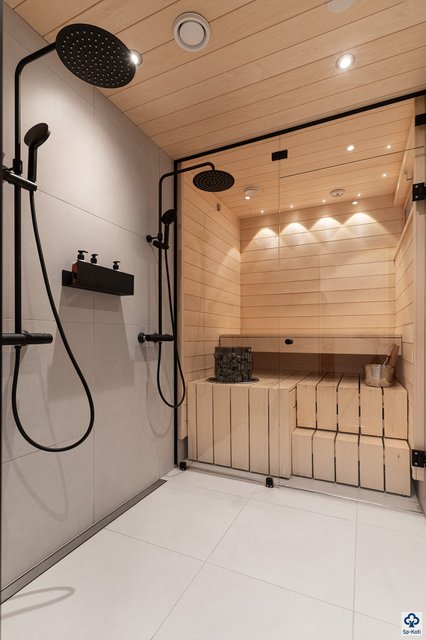 - Alakerrassa; pesuhuone, jossa 2 suihkua, sauna, khh sekä erillinen wc Yläkerrassa; pesuhuone suihku ja wc: