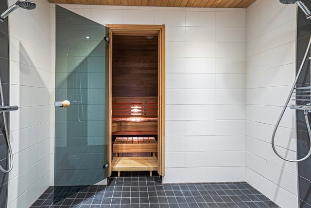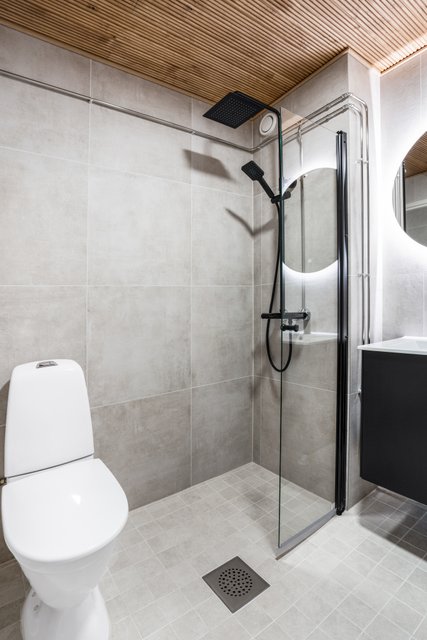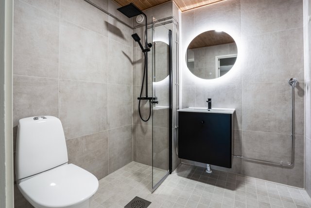 - WC-istuin (Uusi), suihku (Sadetinsuihku), suihkuseinä (Uusi), pesukoneliitäntä (Uusi), peili (Uusi, taustavalolla), pesuallas (Uusi), allaskaappi (Uusi), ja lattialämmitys