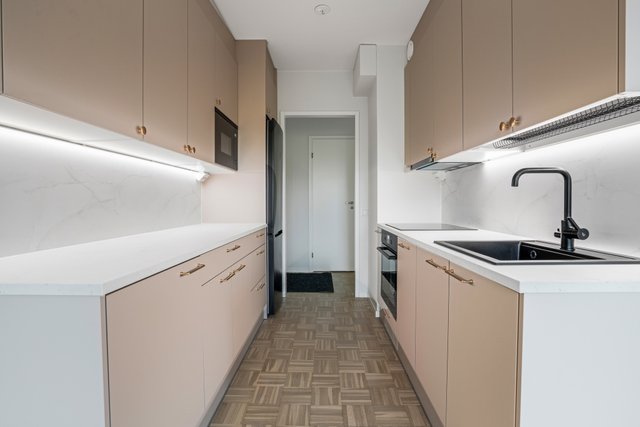 Asunnon keittiö on täysin uusittu ja varusteltu nykyaikaisin laittein, kuten induktioliedellä ja integroidulla astianpesukoneella. Välitilan valaistus hoituu vaikka kännykällä. Kylpyhuoneessa on käytetty premium-tason materiaaleja, ja sieltä löytyy muun muassa sadetinsuihku ja lattialämmitys. Asunnon lattiat ovat tyylikästä parkettia, mikä luo yhtenäisen ja laadukkaan ilmeen.