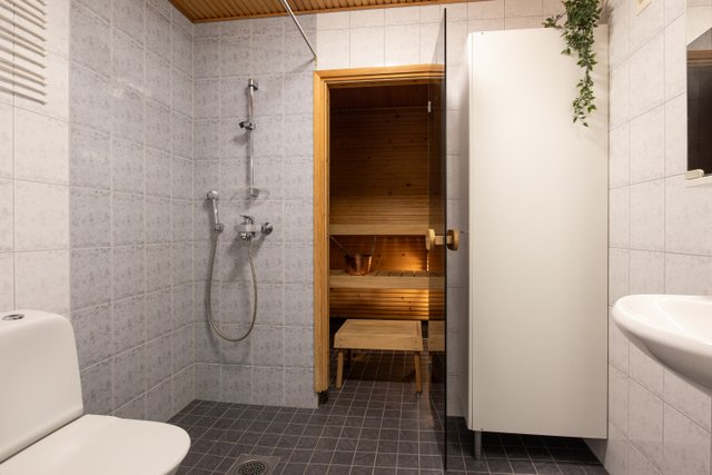 - WC-istuin, suihku, lattialämmitys, pesukoneliitäntä, bidee-suihku, pesuallas, ja peilikaappi