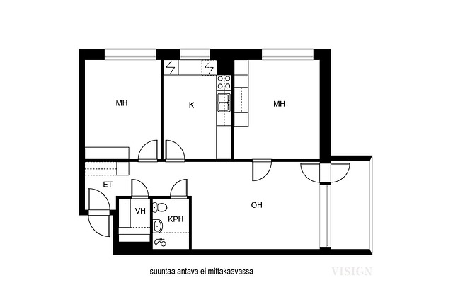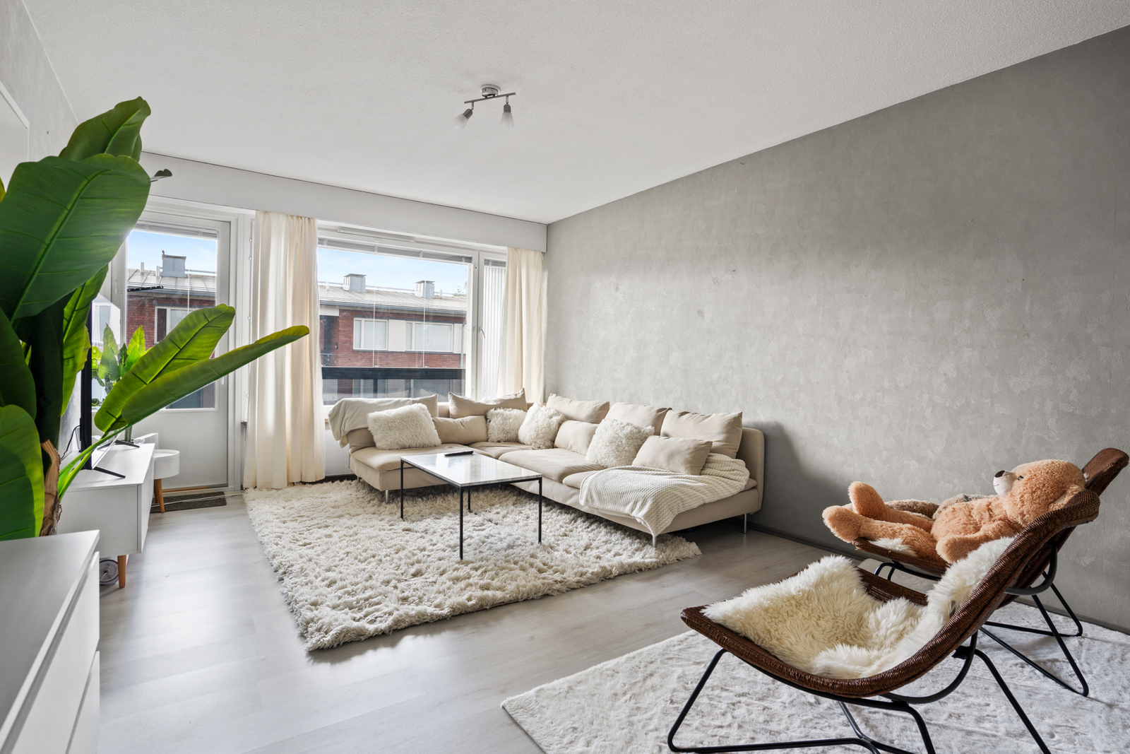 Kaksi reilun kokoista makuuhuonetta kiintokaapistoin varustettuna. Vaatteille, kodin tekstiileille sekä tavaroille löytyy säilytystilaa kiintokaapistojen lisäksi myös erillisestä vaatehuoneesta. Suuri olohuone, jonka kautta käynti lasitetulle ja vasta remontoidulle parvekkeelle. Kaikkien oleskelutilojen lattiat on laminaatilla. Keittiössä LED-nauha välitilassa. Kylpyhuone laattapinnoin ja varustuksesta löytyy mm. pesukoneliitäntä.