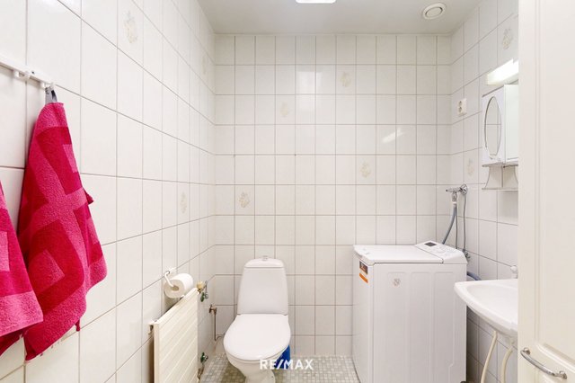 - Tilavan erillis-wc:n varustuksiin kuuluu wc-istuin, lavuaari, bideesuihku, peilikaappi sekä kaapisto, joka tarjoaa mukavasti säilytystilaa. Lisäksi tilassa on pesukoneliitäntä ja tilavaraus pesukoneelle. Lattia ja seinät ovat laatoitetut.