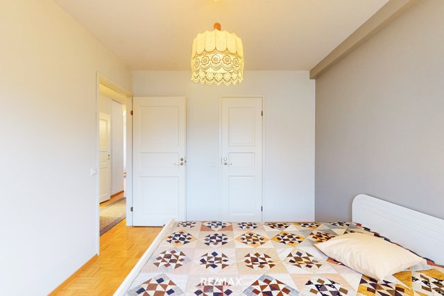 - Suuri makuuhuone hurmaa rauhallisella tunnelmallaan. Pohjoiseen suuntautuva ikkuna on makuuhuoneeseen täydellinen; täällä ei aamuaurinko häiritse herkkäunista. Erillinen vaatehuone tuo kaivattua säilytystilaa. Makuuhuoneen lattia on parkettia ja seinät ovat maalatut.