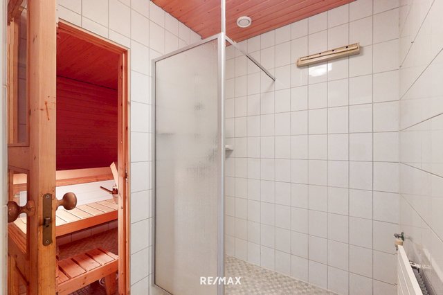 - Vaaleasävyinen, laatoitettu pesuhuone, jonka varustuksiin kuuluu suihku ja suihkuseinä. Pesuhuoneen yhteydessä sijaitsee huoneiston oma sauna.