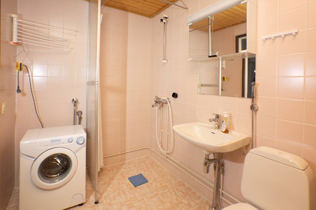 - WC-istuin, suihku, pesukoneliitäntä, peilikaappi, ja pesuallas