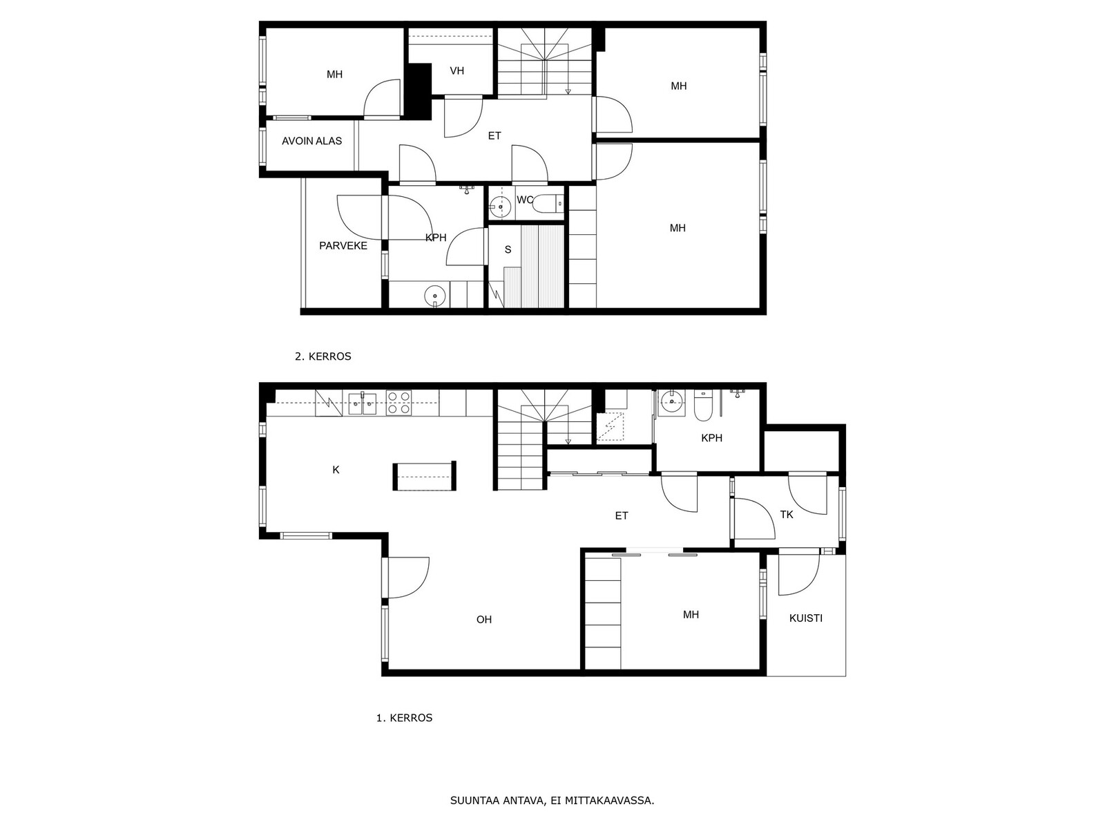 - Yksi makuuhuone alakerrassa, kaksi makuuhuonetta yläkerrassa