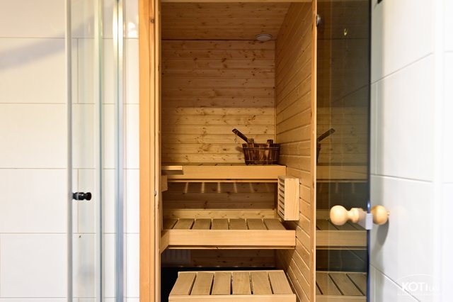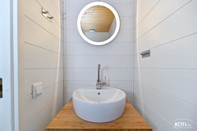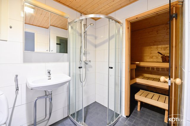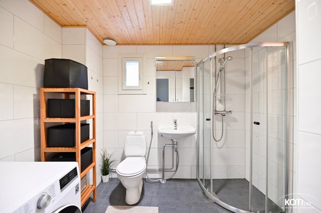 - WC-istuin, suihku, pesukoneliitäntä, suihkukaappi, lattialämmitys, peilikaappi, ja pesuallas