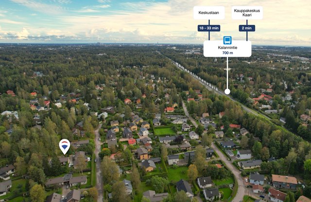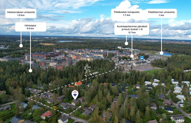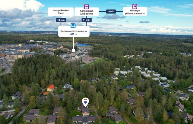 Tervetuloa keskuspuiston kupeeseen Hakuninmaan idylliselle pientaloalueelle. Pienet mutkittelevat kadut tuovat rauhallisen tunnelman, luopumatta kuitenkaan erittäin hyvistä liikenneyhteyksistä. Hämeenlinnanväylän bussipysäkille kävelee noin 6-8 minuutissa ja suorat linjat kulkevat keskustaan parhaimmillaan 18 minuutissa. Kuninkaantammesta kulkee myös nopea bussi Kaareen ja juna-asemalle, josta jatkoyhteys keskustaan vain 14 minuuttia. Koulumatka Kuninkaantammen uudenveroiseen kouluun (luokat 1-4) on helppokulkuinen ja alle 10 minuutin kävely. Alueen kohokohtana on upeat ulkoilumaastot sisältäen peräti kaksi uimarantaa kävelyetäisyydellä. Täällä asuessasi pulahdat kesäisin uimaan vaikka joka päivä!